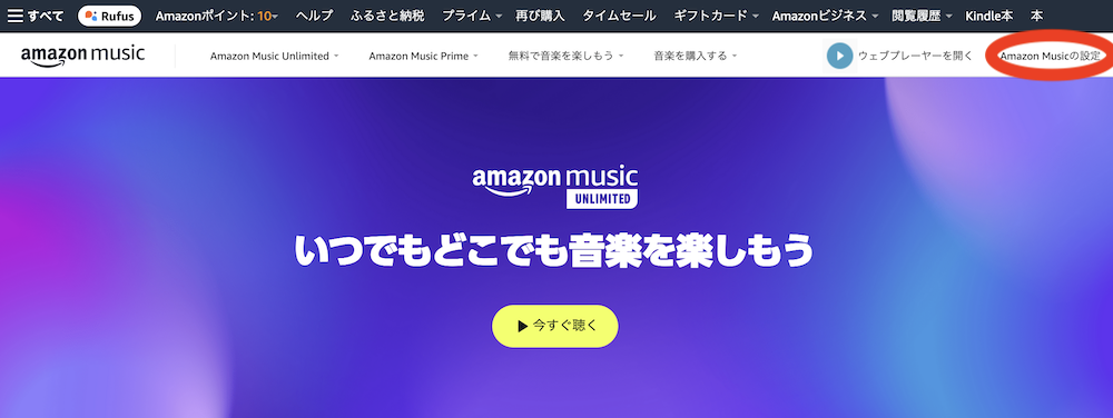 Amazon公式サイトのトップ画面から開く場合は、左上の「すべて」を選び、メニューから「Amazon Music」を選択、「Amazon Music Unlimited」を開き、トップ広告の下にある「Amazon Musicの設定」を選択する。