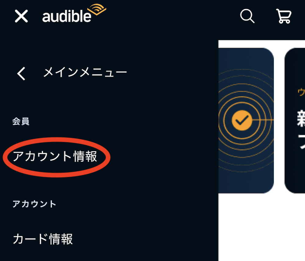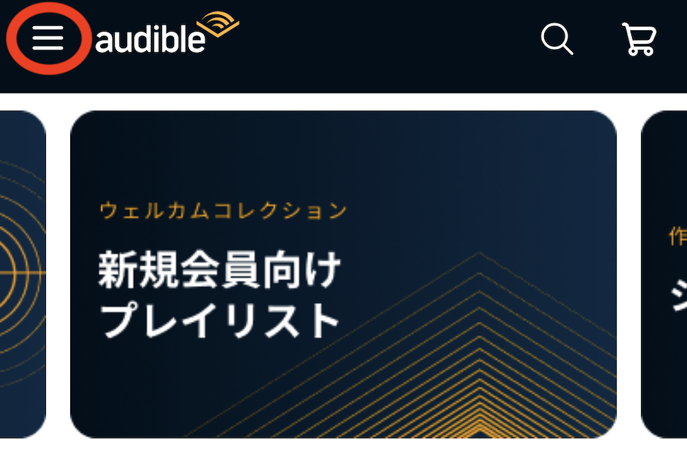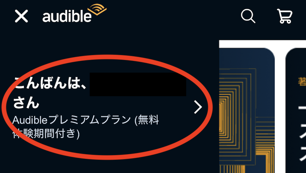 Audibleの公式サイトから移動する場合、メインメニューを開いて名前をクリックする。