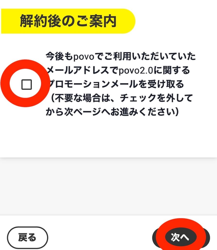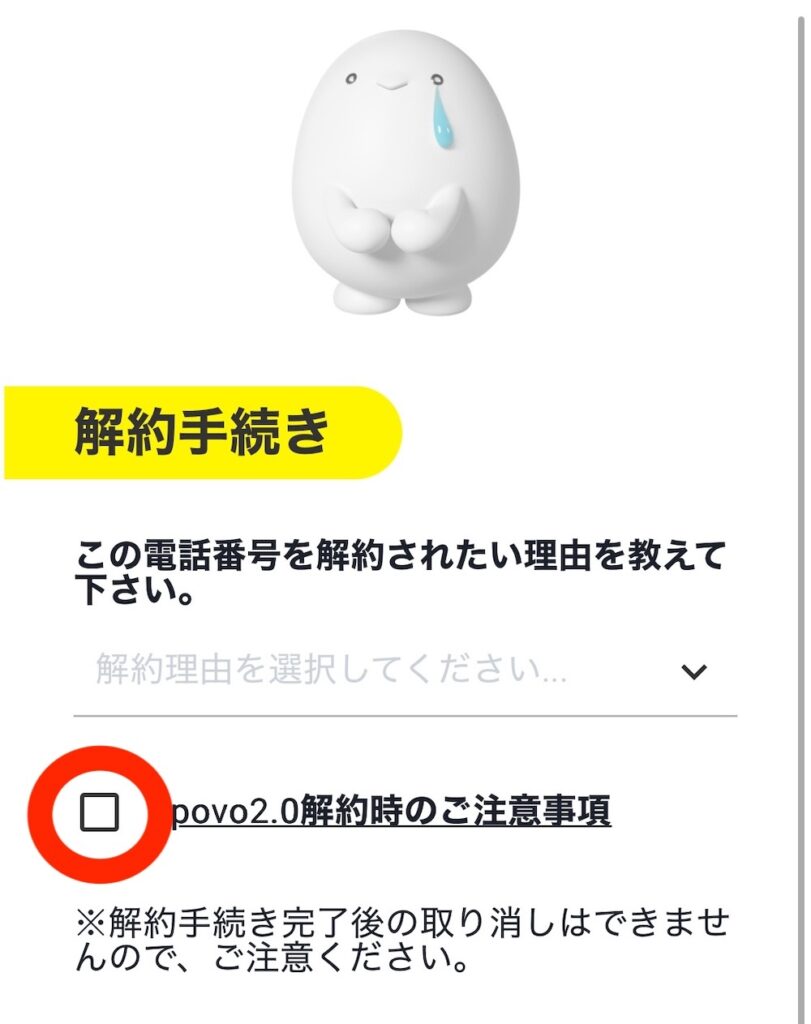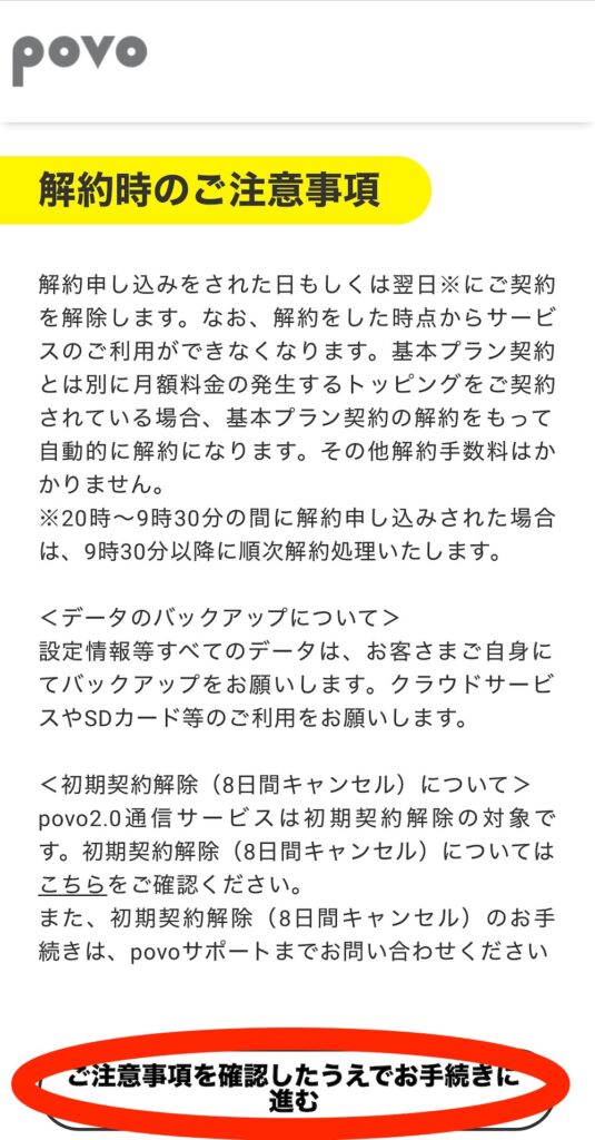 「povo解約時のご注意事項」にチェックを入れて進む