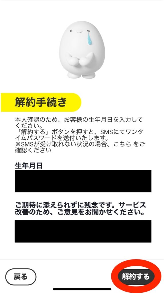 生年月日と意見(あれば)を入力し、「解約する」を選択する
