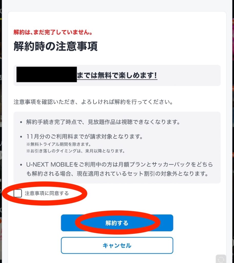 「注意事項に同意する」のチェックを入れて「解約する」を選択